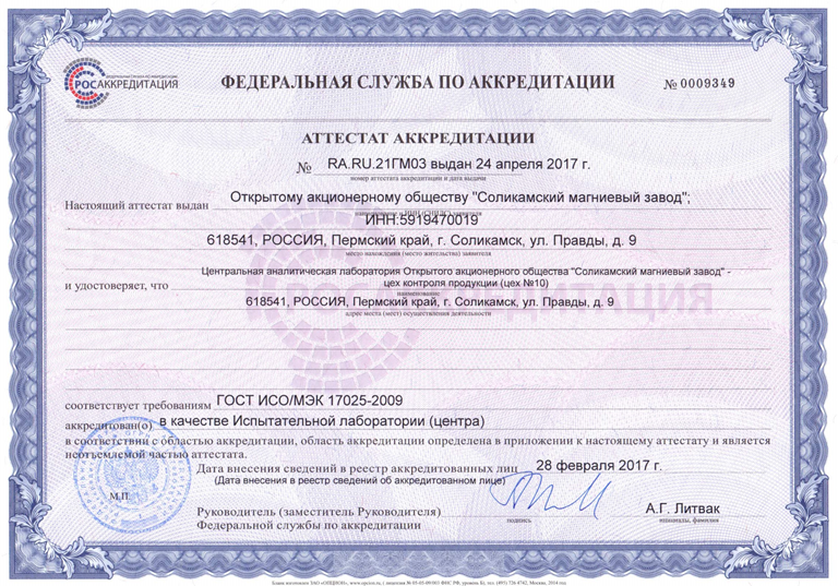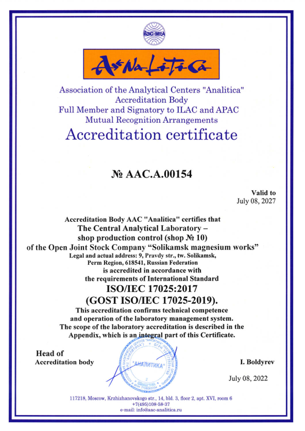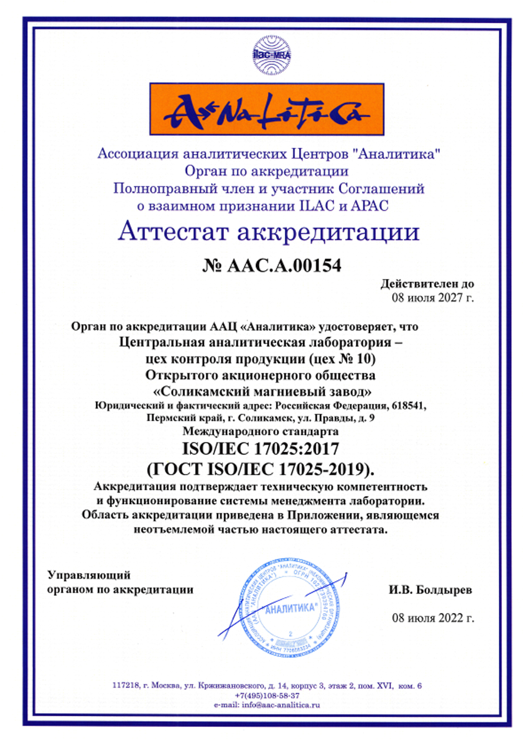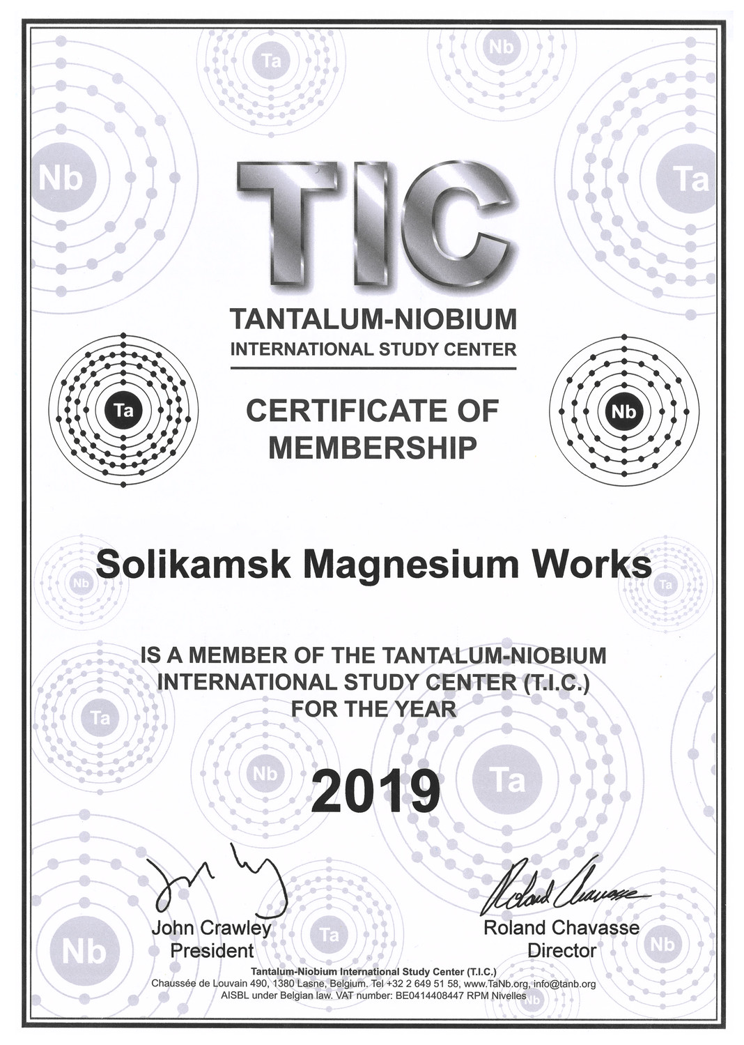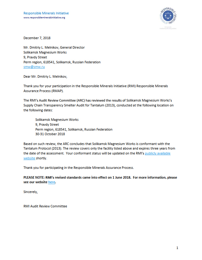 Предприятие занимает лидирующие позиции в редкометальной и магниевой отраслях Российской Федерации, является международно признанной компанией, и должно быть уверено в том, что своей деятельностью способствует сохранению окружающей среды, производству продукции надлежащего качества и норм этики при закупках танталового сырья для своего производства.